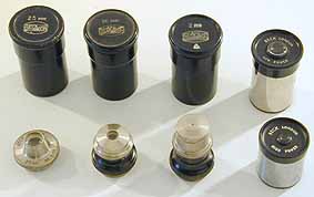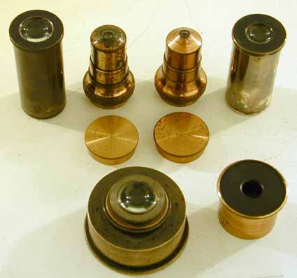 of stops sub-stage condenser, dark well sub stage condenser with 3 inserts and 2 objectives in lacquered brass cans (1 ½ in & 4/10