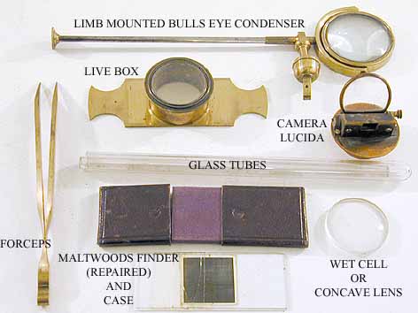 condenser, a live box, a large pair of brass forceps, two glass tubes, an