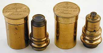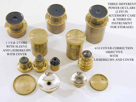 objectives, a 1/6, & 2/3 inch, with lacquered brass cans. It has three
