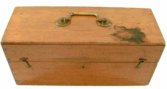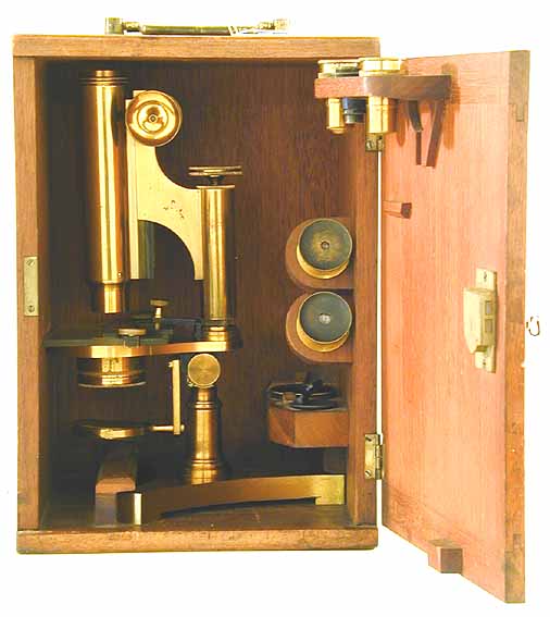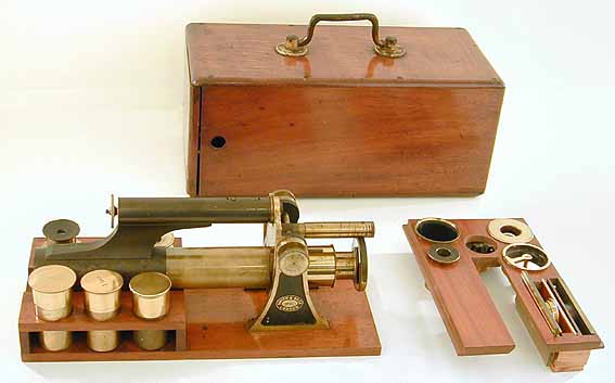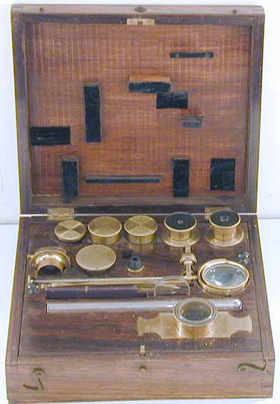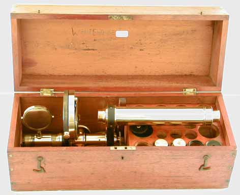 mahogany case with brass handle, hinges and lock. The optics are all in good