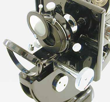 set of wheels of stops, dark grounds and filters below a lever operated iris