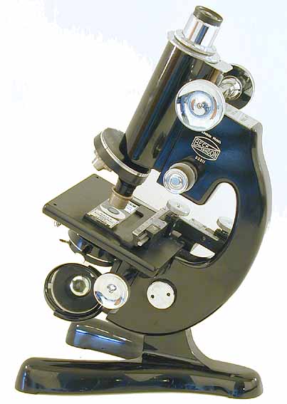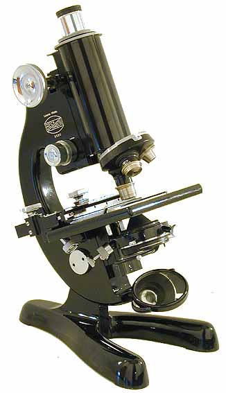 sub-stage, a plano-concave mirror on an articulated arm, all mounted on twin pillars
