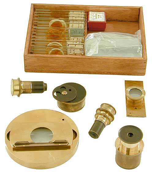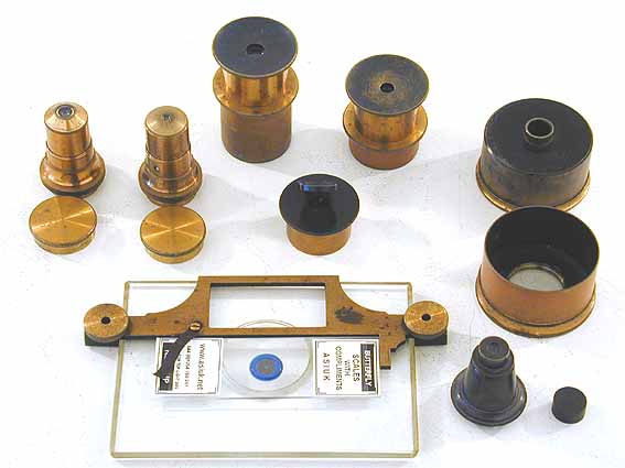diaphragm, two top hat type eyepieces and three objectives (2 inch, 1 inch