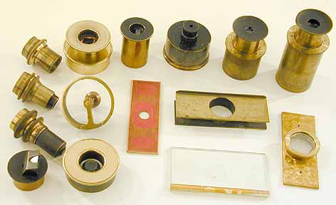 ledge, packet of cover slips, large stage forceps, tweezers, lieberkuhn, wheel