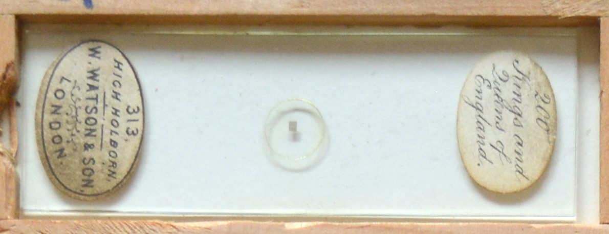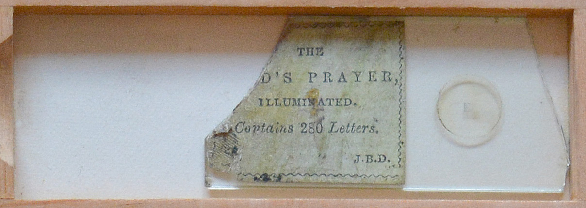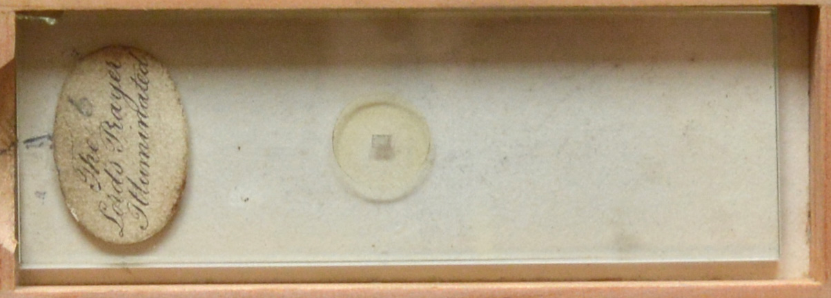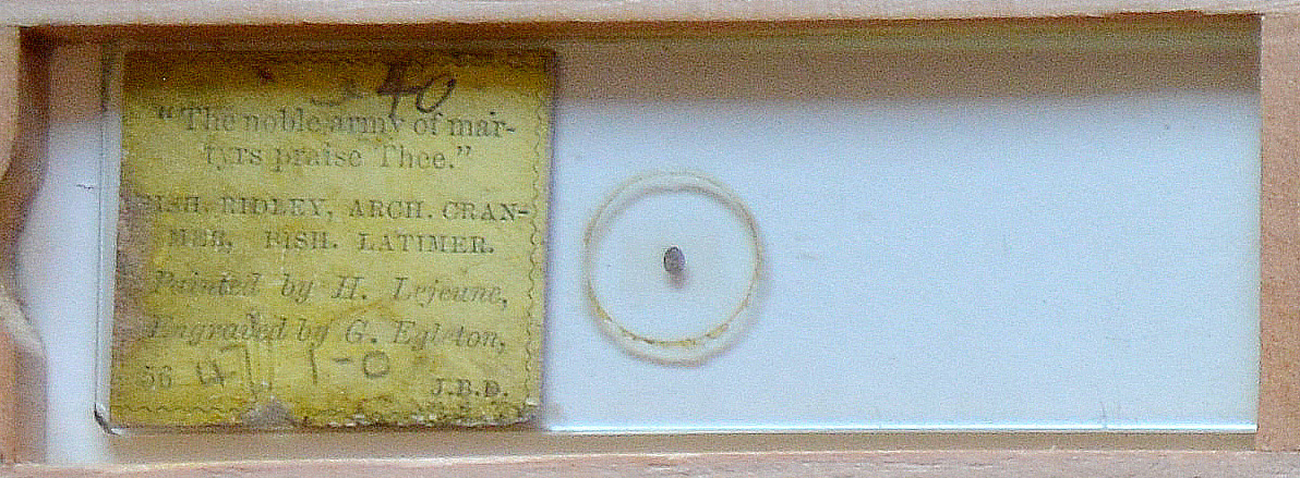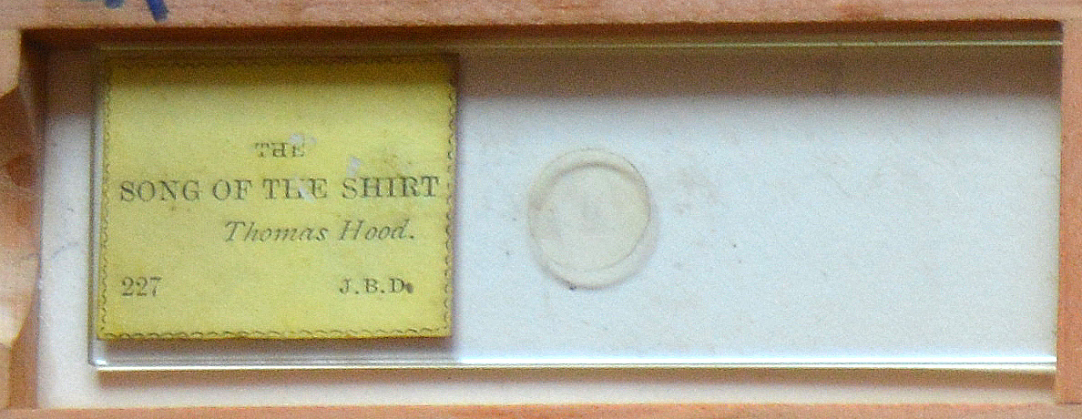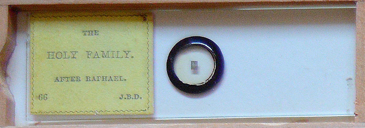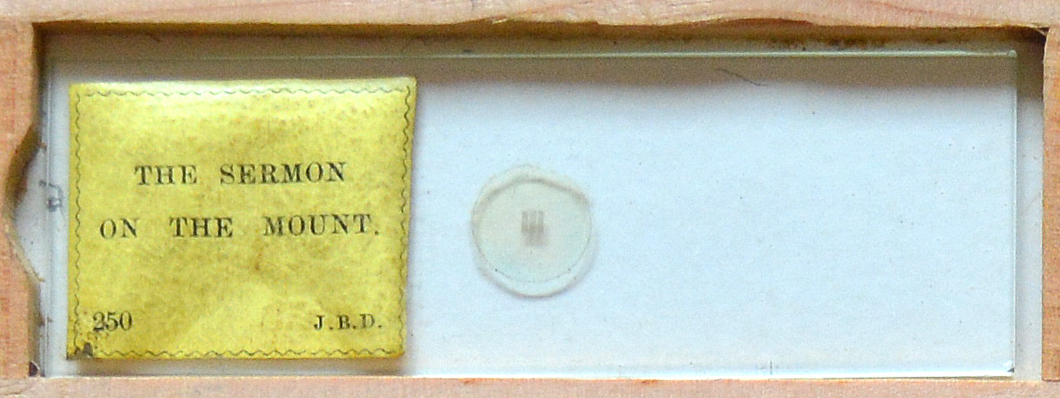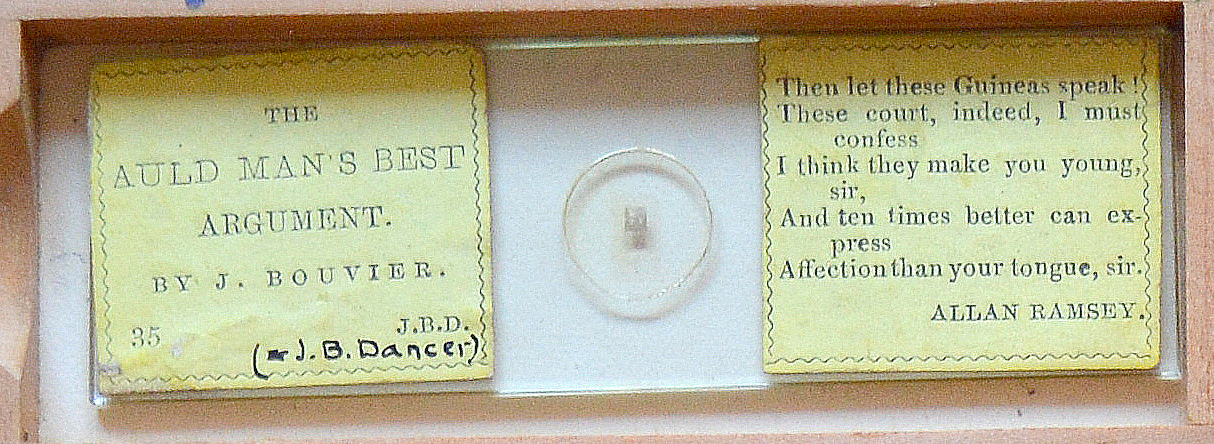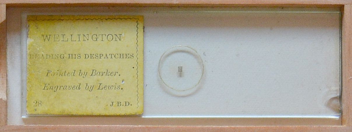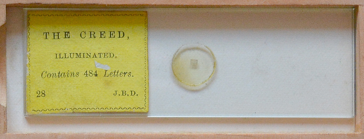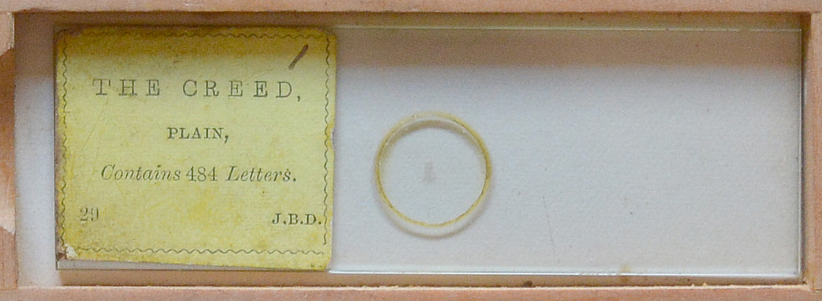 Much of what can be said about Dancer's microphotographs appears in the book “The Microscopic Photographs of J.B.Dancer” by Bracegirdle & McCormick. This book is an excellent reference source for collectors of these slides as it catalogues all the known examples when it was first published. However, that was more than 25 years ago and some discrepancies have arisen since, as more physical evidence has come to light over the years. Also, be aware of errors made (by Dancer?) in the original numbering of the slides. For example, in my modest collection, I have 2 different slides numbered JBD 28. One is The Creed and the other is of Wellington. The book refers to The Creed as 28 and Wellington as 48 (on Dancer's original list) but the slide illustrated in the book at 48 is actually numbered 28.