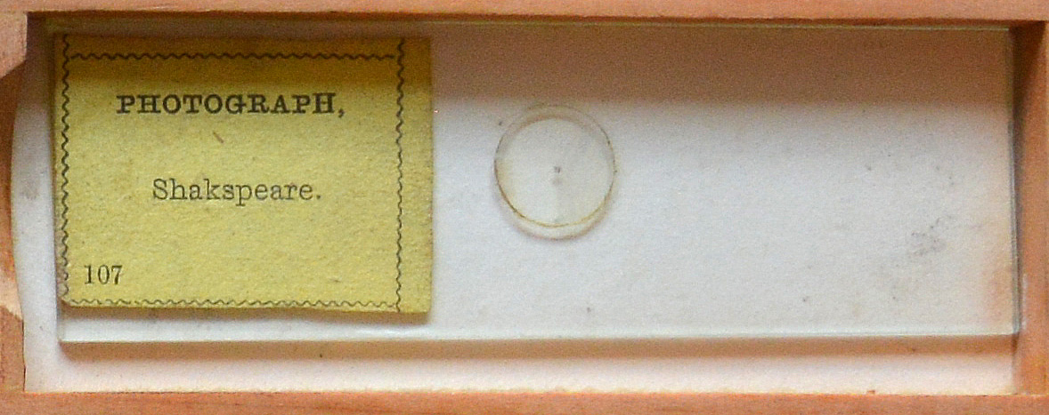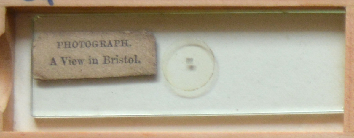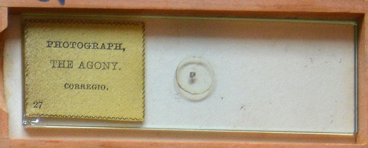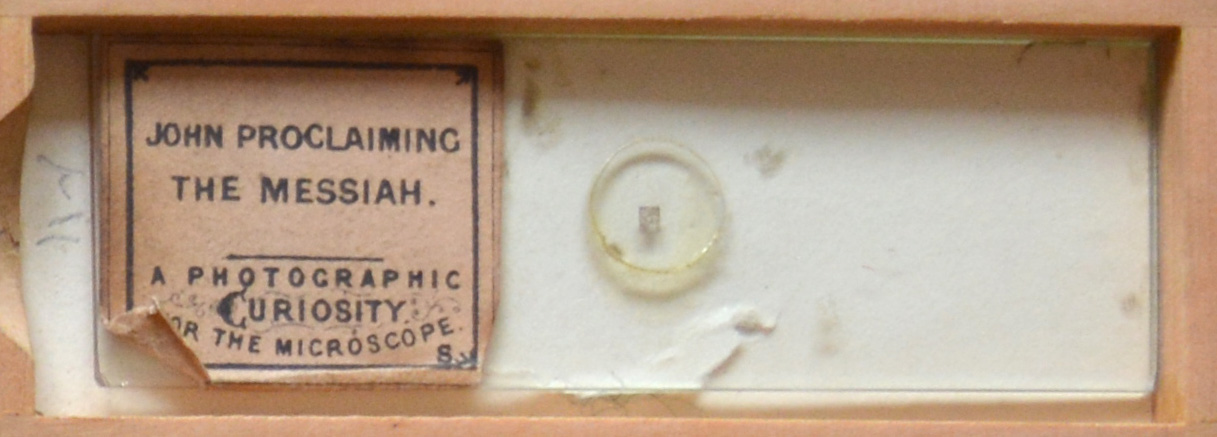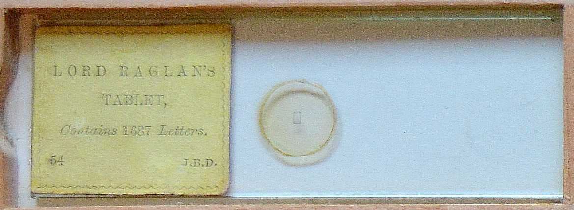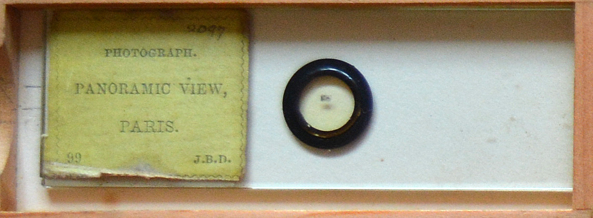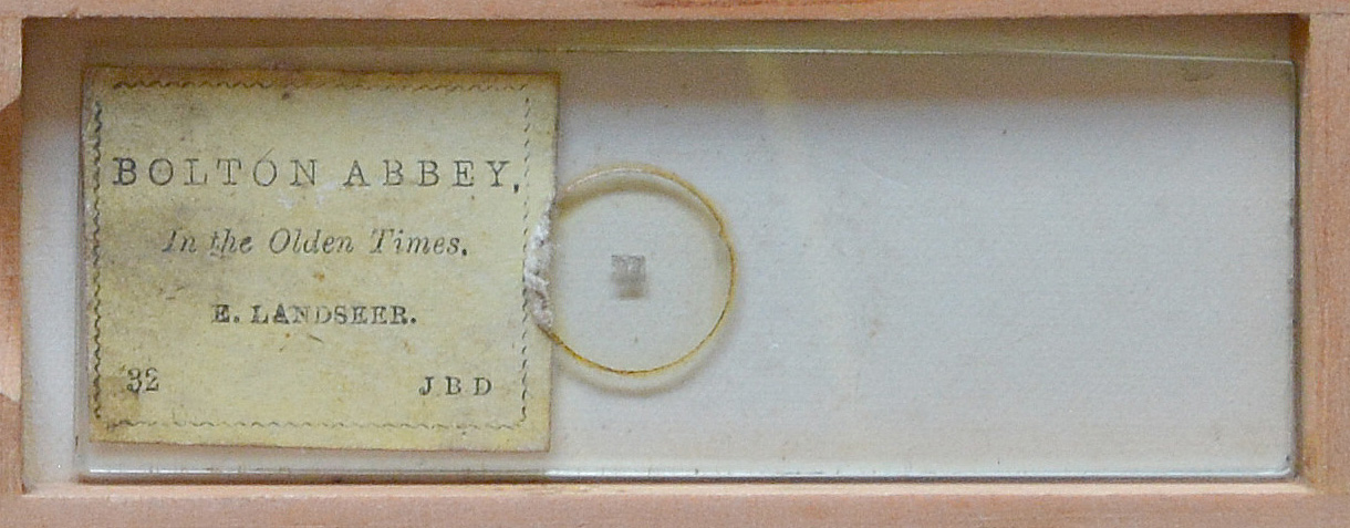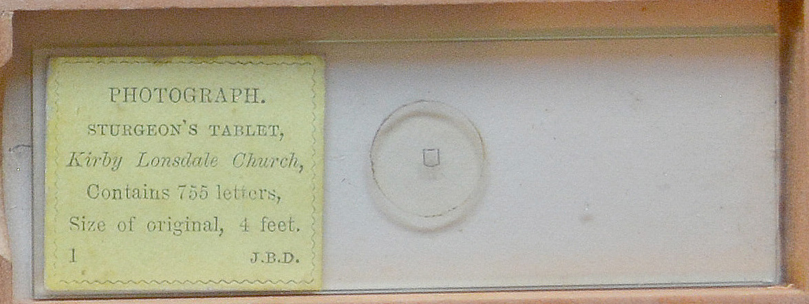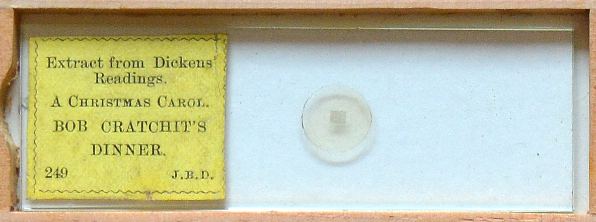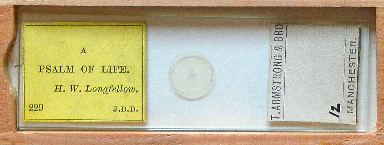 Much of what can be said about Dancer's microphotographs appears in the book “The Microscopic Photographs of J.B.Dancer” by Bracegirdle & McCormick. This book is an excellent reference source for collectors of these slides as it catalogues all the known examples when it was first published. However, that was more than 25 years ago and some discrepancies have arisen since, as more physical evidence has come to light over the years. Also, be aware of errors made (by Dancer?) in the original numbering of the slides. For example, in my modest collection, I have 2 different slides numbered JBD 28. One is The Creed and the other is of Wellington. The book refers to The Creed as 28 and Wellington as 48 (on Dancer's original list) but the slide illustrated in the book at 48 is actually numbered 28.