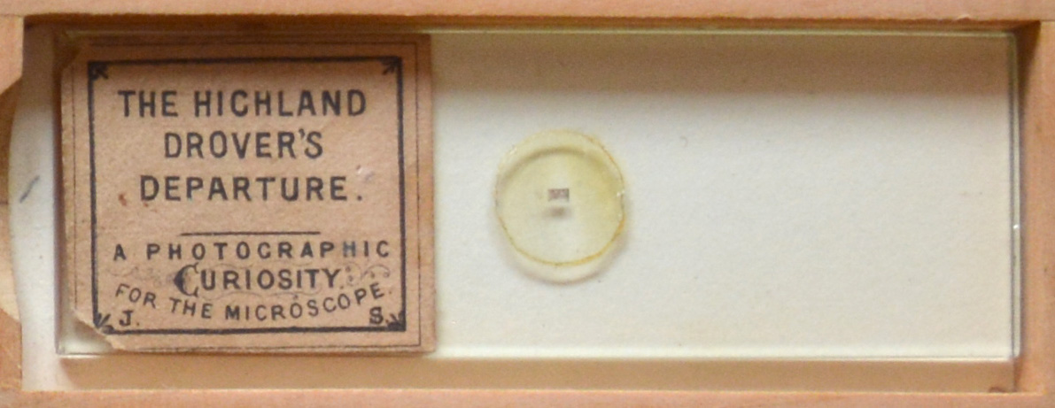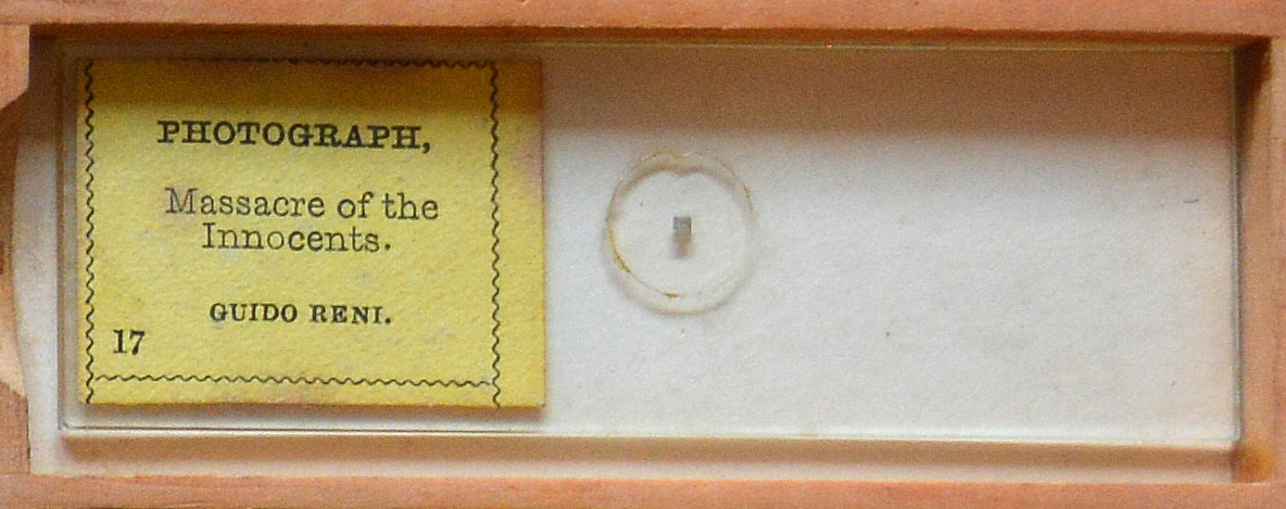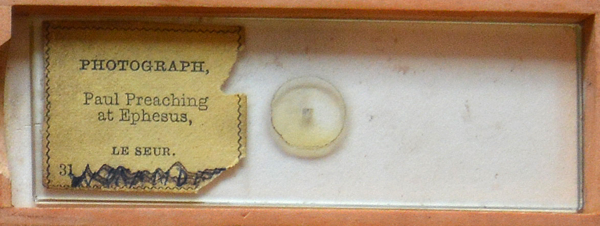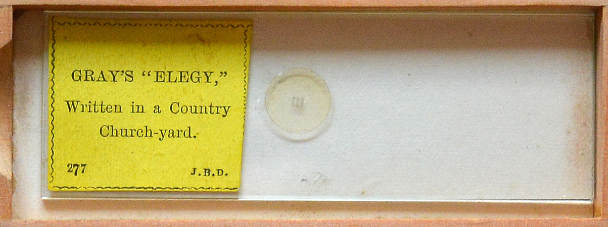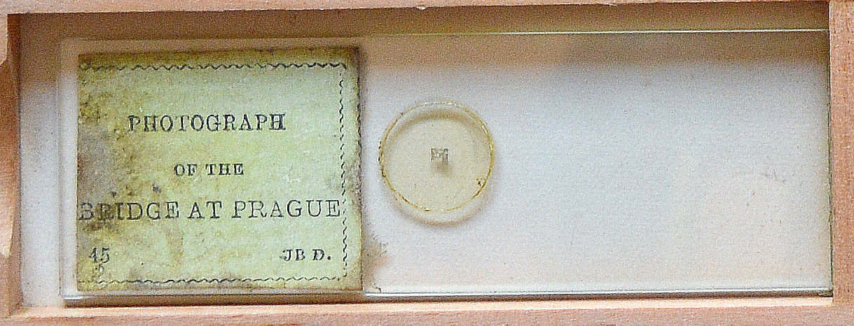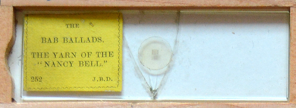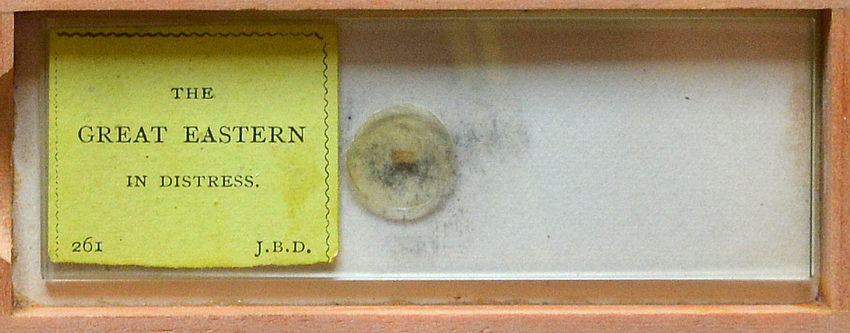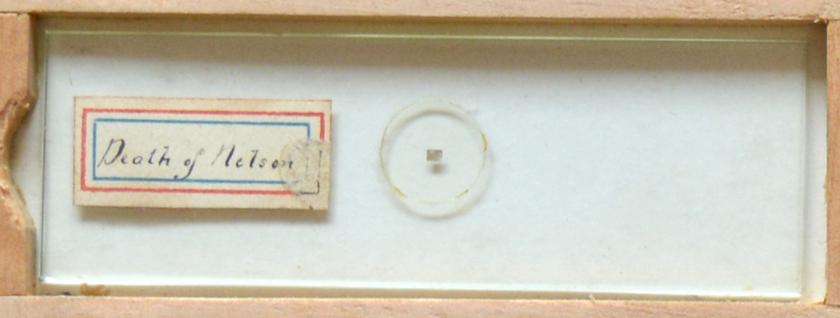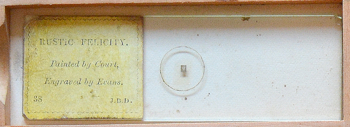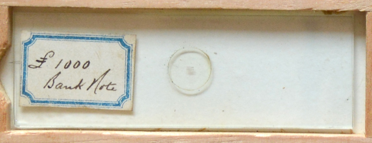 Much of what can be said about Dancer's microphotographs appears in the book “The Microscopic Photographs of J.B.Dancer” by Bracegirdle & McCormick. This book is an excellent reference source for collectors of these slides as it catalogues all the known examples when it was first published. However, that was more than 25 years ago and some discrepancies have arisen since, as more physical evidence has come to light over the years. Also, be aware of errors made (by Dancer?) in the original numbering of the slides. For example, in my modest collection, I have 2 different slides numbered JBD 28. One is The Creed and the other is of Wellington. The book refers to The Creed as 28 and Wellington as 48 (on Dancer's original list) but the slide illustrated in the book at 48 is actually numbered 28.