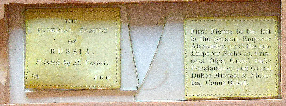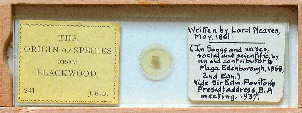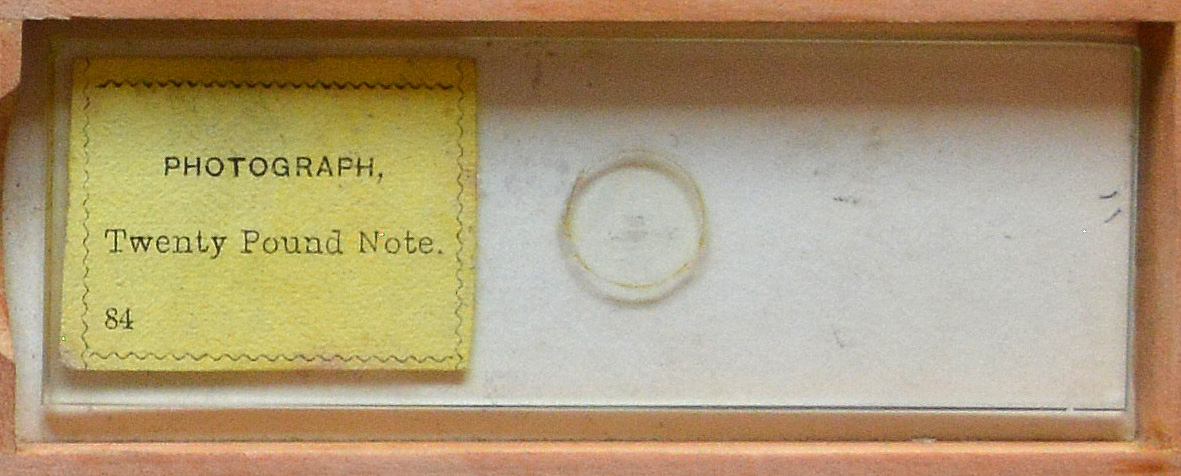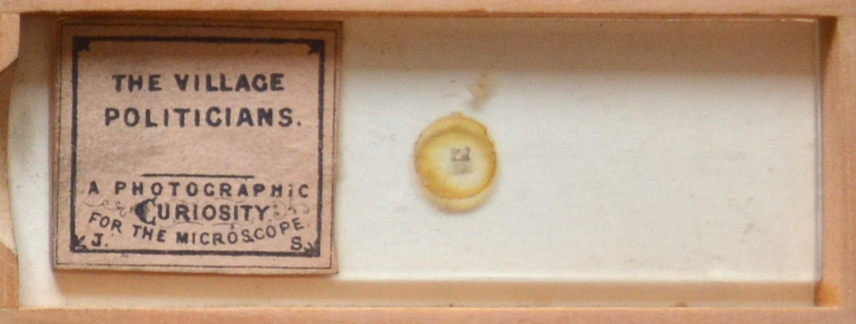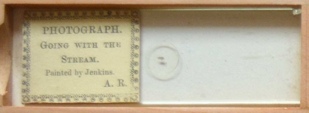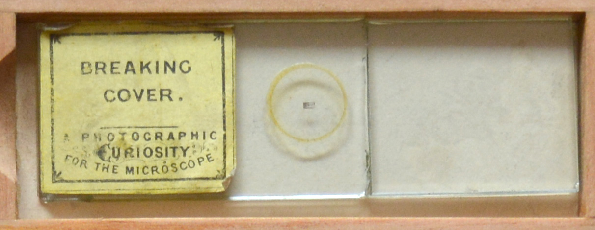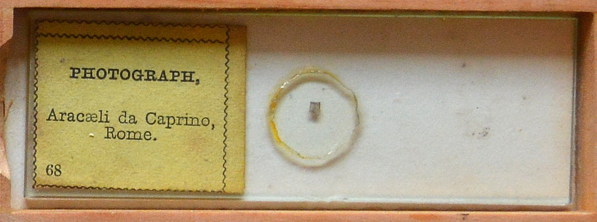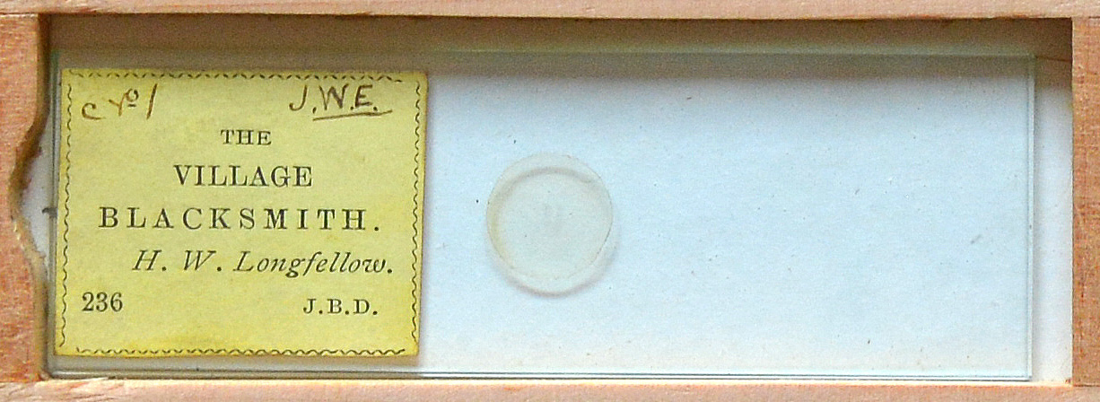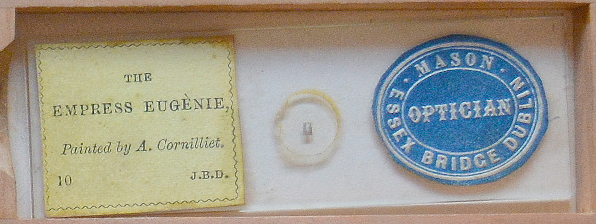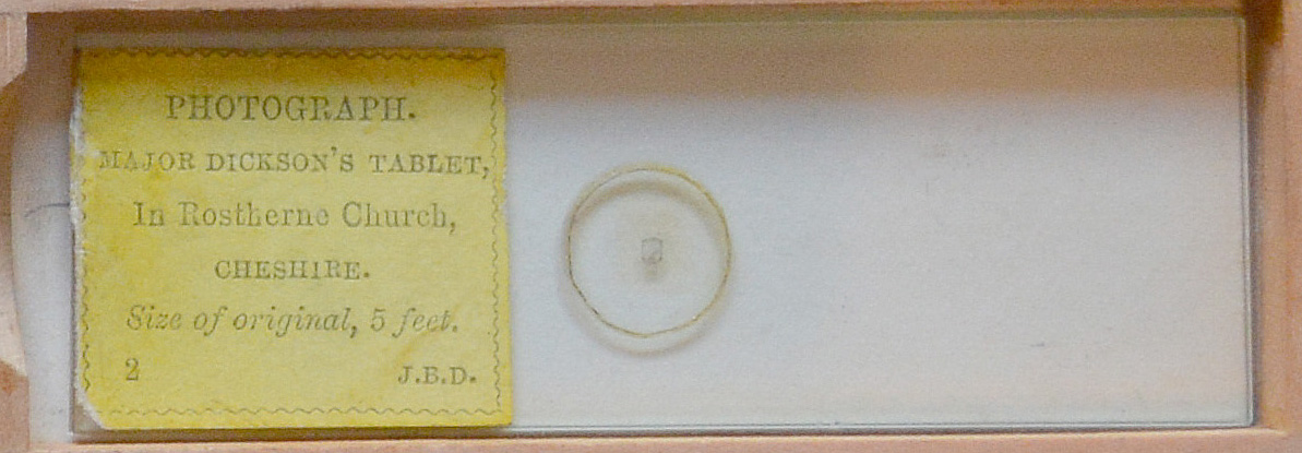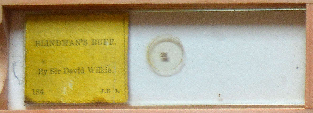 Much of what can be said about Dancer's microphotographs appears in the book “The Microscopic Photographs of J.B.Dancer” by Bracegirdle & McCormick. This book is an excellent reference source for collectors of these slides as it catalogues all the known examples when it was first published. However, that was more than 25 years ago and some discrepancies have arisen since, as more physical evidence has come to light over the years. Also, be aware of errors made (by Dancer?) in the original numbering of the slides. For example, in my modest collection, I have 2 different slides numbered JBD 28. One is The Creed and the other is of Wellington. The book refers to The Creed as 28 and Wellington as 48 (on Dancer's original list) but the slide illustrated in the book at 48 is actually numbered 28.