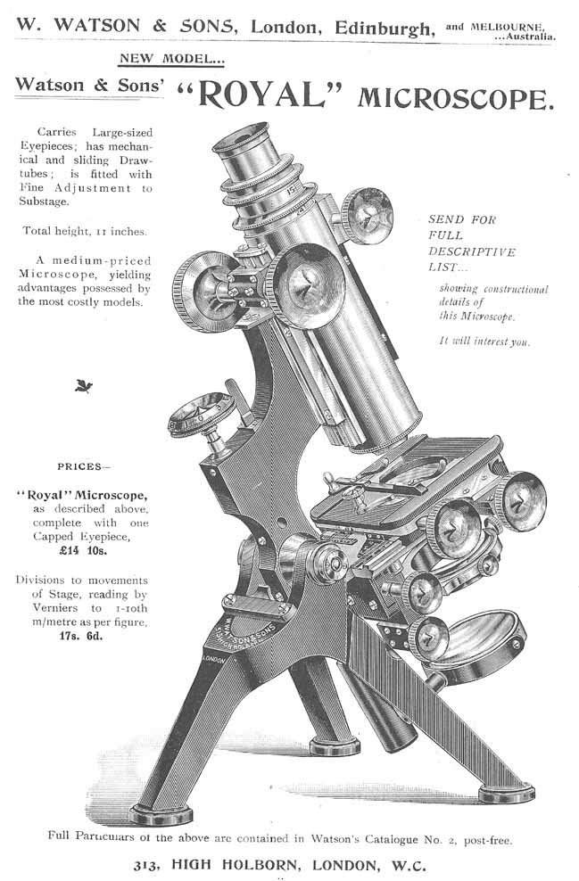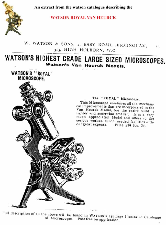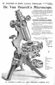 Watson catalogues were not shy in advertising the advantages of their microscopes as seen in an extract from a Watson catalogue showing THE THREE VAN HEURCKs (every bit as classy as The Three Tenors, but slimmer).
