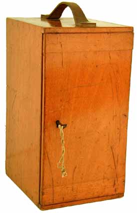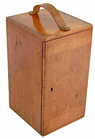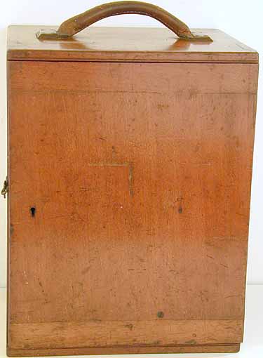 with brass hinges, leather handle and working lock and key. A truly