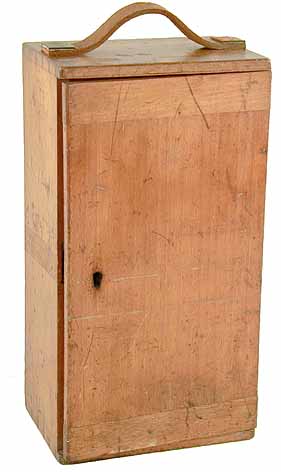 leather covered handle, brass hinges to the door and a working lock &